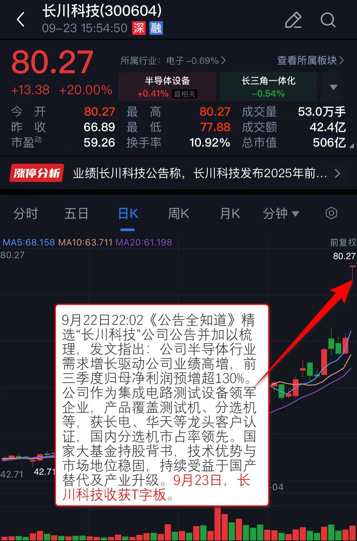 9月22日22:02《通知布告全晓得》精选“长川科技”公司通知布告并加以梳理,
