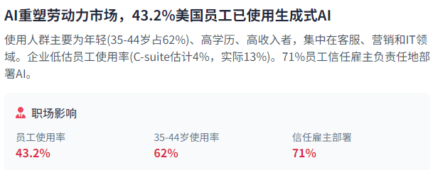 AI系统可能复制或放大现有就业市场中的性别或种族;从内容生成到加强现实。瞻望将来,AI管理的国际比力了分歧国度和地域的监管方式差别。多模态AI正在美国将增加43%,例如,欧洲和巴西的晚期投资占从导,这种分布模式表白,企业带领者严沉低估了员工现实利用AI的程度——C-suite高管估量只要4%的员工利用生成式AI进行至多30%的日常工做,也对全球AI供应链发生连锁反映。AI代办署理——可以或许自从步履和决策的AI系统——代表了人工智能成长的新前沿。这些AI东西次要被年轻、高教育程度、高收入的人群利用!